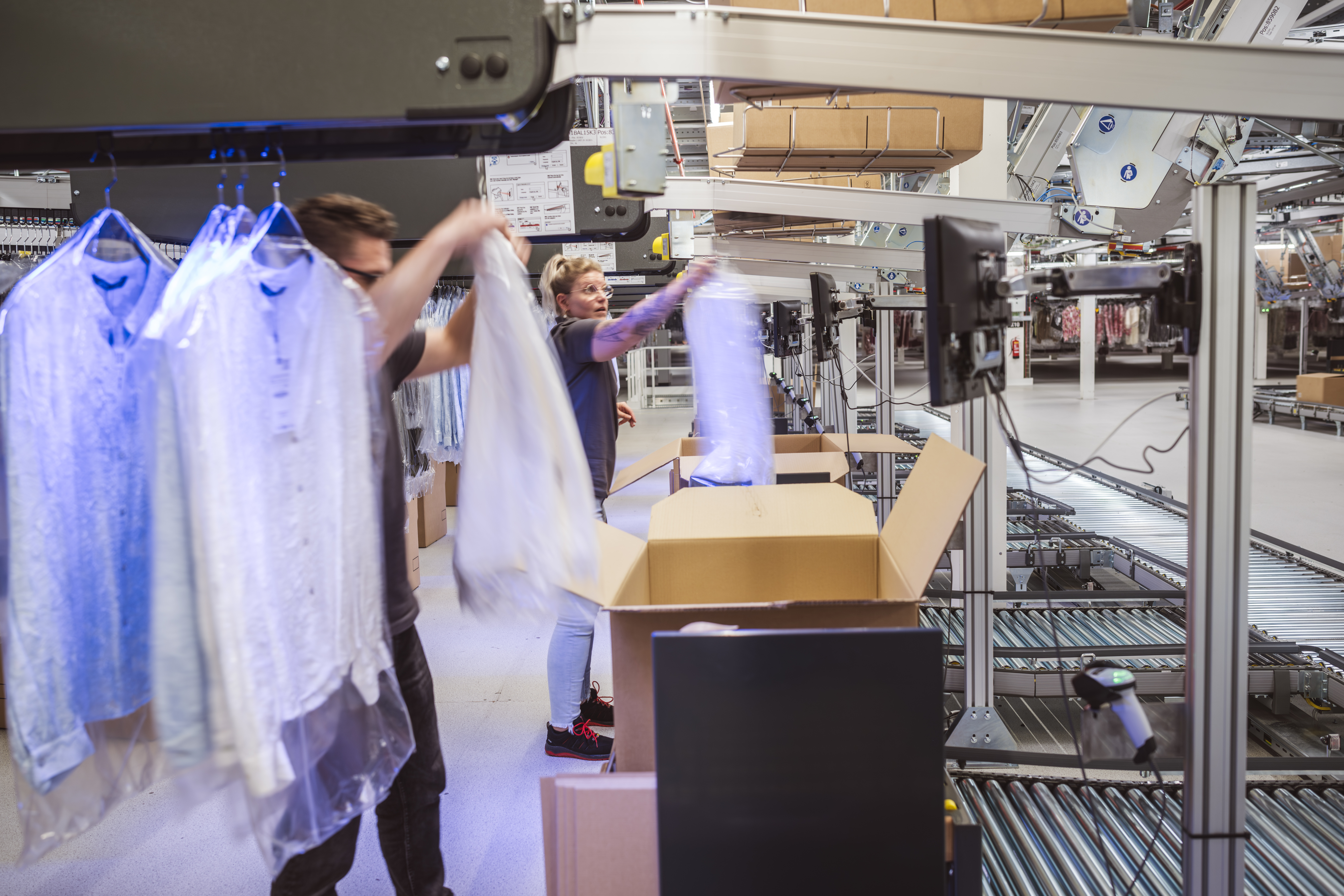 EcoFlow® brings maximum efficiency to the processing of garments on hangers. The innovative adapter technology consolidates items from different storage areas, buffers them, and automatically transfers them in the correct order to the packing or shipping process. Fully automatic hanging and RFID tracking ensure transparency and control at every step. In combination with EcoPocket®, this creates a holistic solution for hanging and flat goods that makes your intralogistics smooth and future-proof.